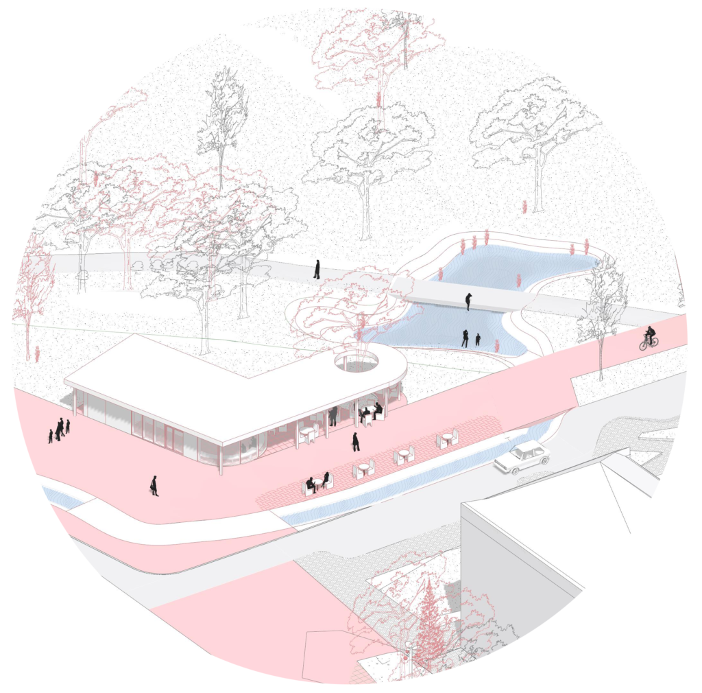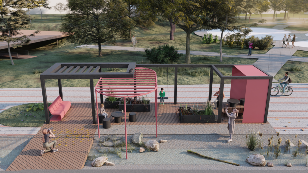 The architecture of the new additions draws inspiration from Jõhvi’s cranberry-themed identity and its playful qualities — rounded forms, combined with carefully selected materials and colors, soften the urban space. The structures are simple in form and construction, making them cost-effective and easy to assemble or relocate, with the park pavilions designed as modular units. Sustainable, reusable materials such as wood and metal have been prioritized. The Veski 1 apartment building’s shelter and the park café pavilion are light and playful in character, blending seamlessly into the park’s lush greenery while framing the surrounding space. The shelter also incorporates public restrooms, waste collection areas, and storage space for park equipment.